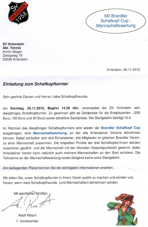 Den Termin für unser Turnier zum Abschluß der Sommersaison haben wir von 15.9. auf 16.9. verlegt. Beginn ist um 10 Uhr. Wir machen gegen 12.30 Uhr eine Grillpause und spielen bis ca. 16 Uhr. Verpflegung bitte selbst mitbringen. Wir können auch Essen bestellen und anliefern lassen.