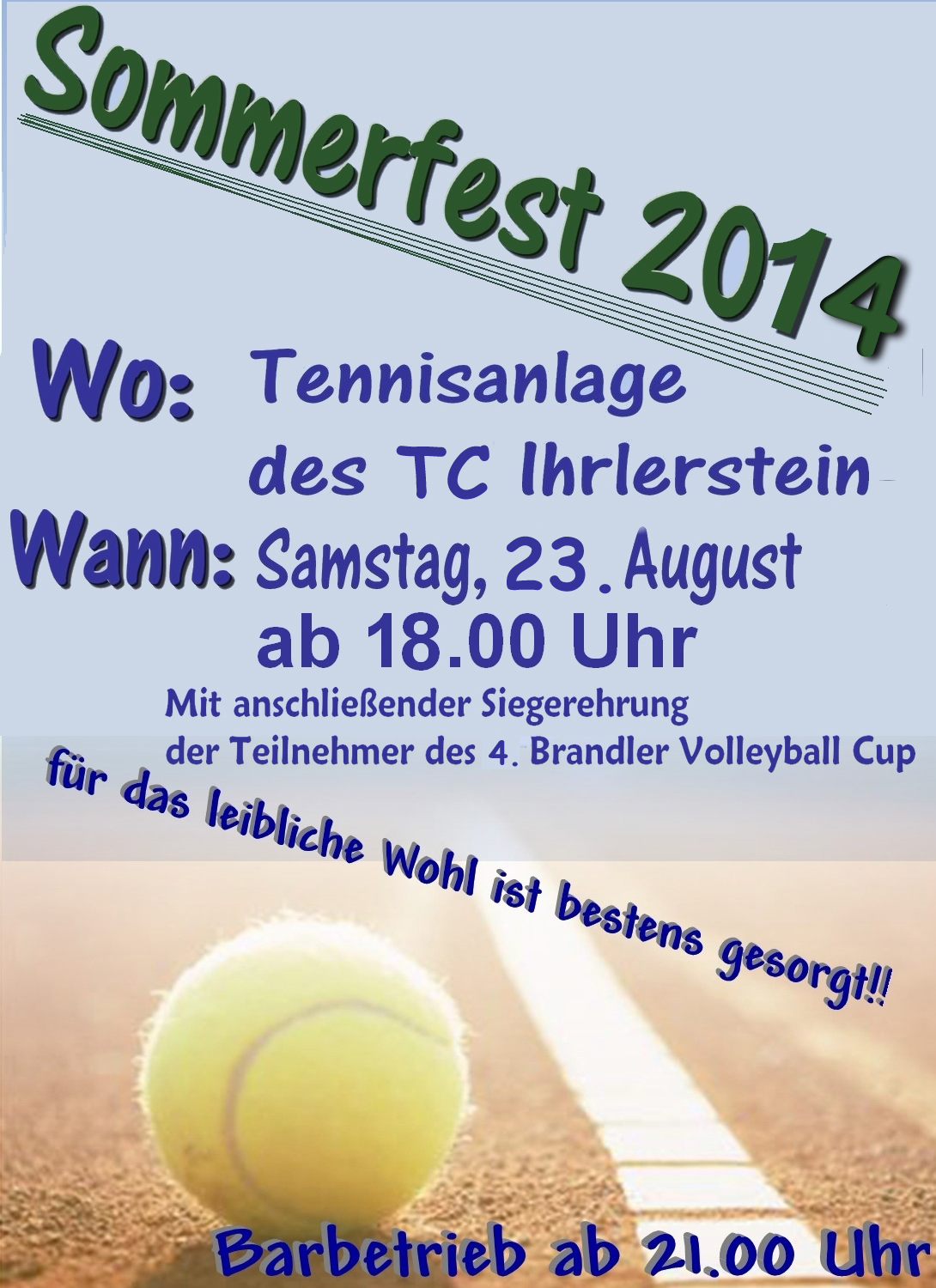 Obwohl die Temperatur nach Sonnenuntergang stetig nach unten ging, blieben viele gut gelaunte Besucher bis nach Mitternacht beim Sommerfest. Mit 130 Liter Bier wurde ein neuer Absatzrekord aufgestellt. Schon um 18.30 Uhr war das kleine Festzelt gut gefüllt mit Volleyballgästen vom Bravo-Cup, die auf die Siegerehrung warteten. Am Abend waren mehr als hundert Leute da und vergnügten sich an der Bar, beim Tanzen im Tennisheim oder beim Ratschen im Zelt. Heizstrahler machten den Abend erträglich und der ein oder andere Cocktail wärmte von innen.