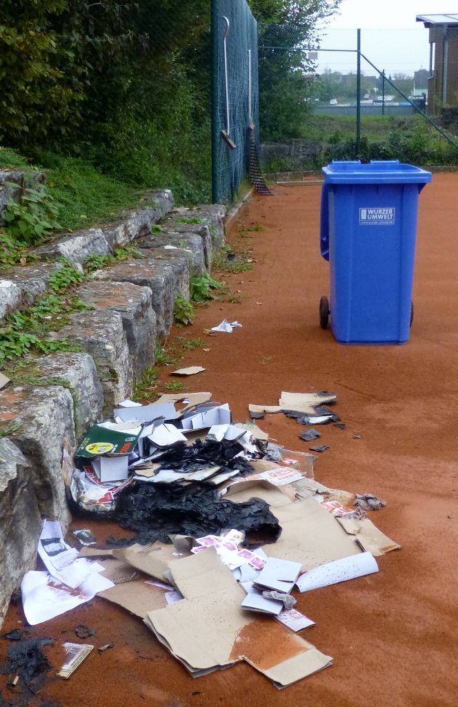 Am Wochenende gabs einige Verwüstungen an unserer Anlage: Die Eingangstüre zur Anlage wurde aus den Scharnieren gerissen und auf das Dach des Tennisheims geworfen, so dass einige Ziegel zu Bruch gingen und die Türe leicht beschädigt wurde. Ein Kabel der Satellitenanlage wurde rausgerissen, die Infotafel aus Kork beschmiert und eingedrückt, Zigaretten auf dem Terrassentisch ausgedrückt und der Tisch beschmiert. Zu guter letzt wurde die Papiertonne vom SVI-Vereinsheim heruntergefahren, auf dem Tennisplatz entleert und das Papier angezündet.