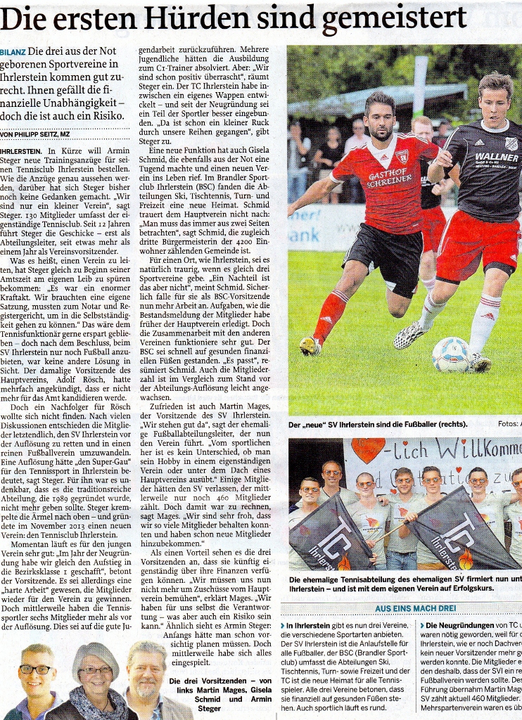 Kurz vor Jahresende war ein Bericht über die drei neuen Sportvereine in Ihrlerstein in der Mittelbayerischen Zeitung vom 30.12.2014.