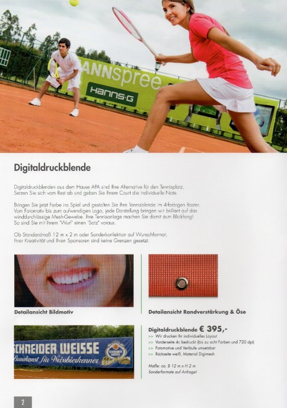 Da schlägt man den neuen, 2014er Werbeprospekt der Firma APA aus Neuwied auf und was sticht auf Seite 2 sofort ins Auge: DIE Tennisblende von Schneider Weisse, die seit letztem Jahr bei uns auf der Tennisanlage hängt. Erkennbar an DEM gelben Wasserschlauch, der NUR auf unseren Plätzen rumliegt.