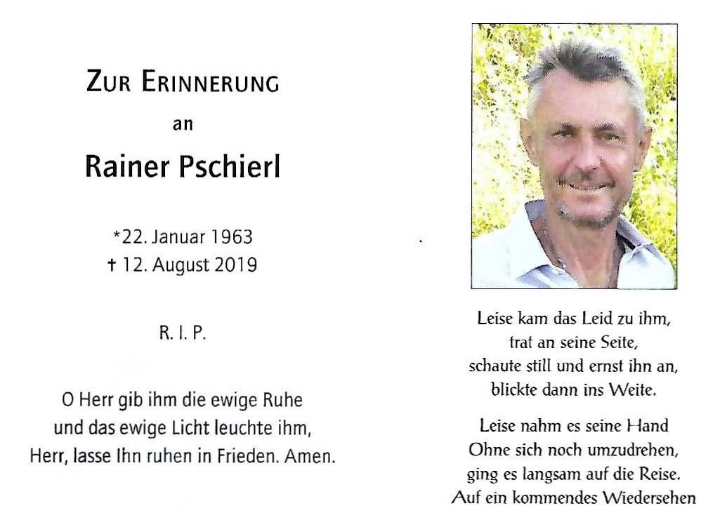Am Montag, den 12. August 2019 ist unser langjähriges Vereinsmitglied Rainer Pschierl nach einer schweren Krankheit verstorben. Sein Tod berührt uns alle tief.
