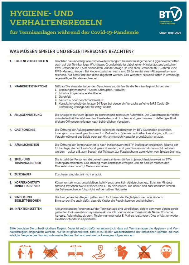 Unser Tennisheim darf derzeit nur zum Holen von Bällen und Getränken betreten werden. Die Terrasse und die Dusch- und Umkleideräume bleiben geschlossen. Die Toiletten können benutzt werden. Die Hygiene- und Verhaltensregelungen auf den bayerischen Tennisanlagen könnt ihr hier lesen.