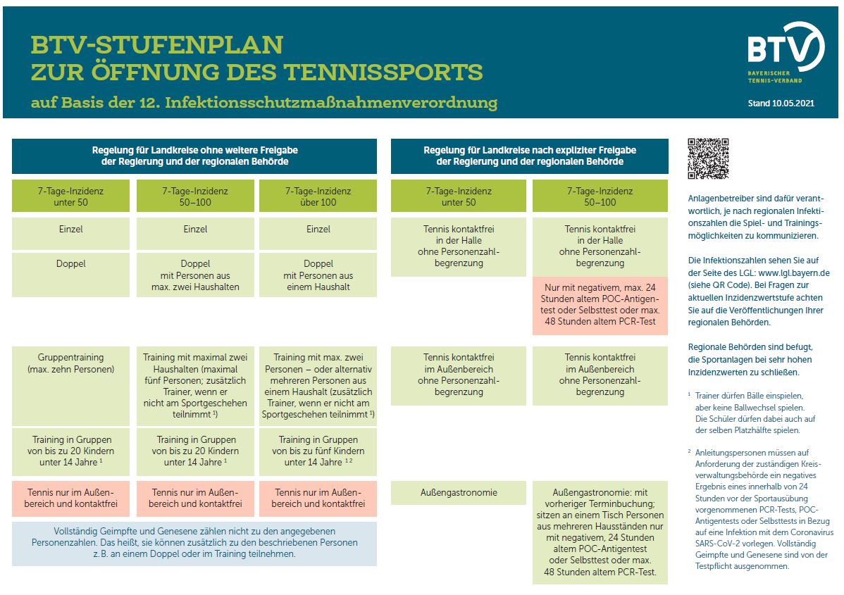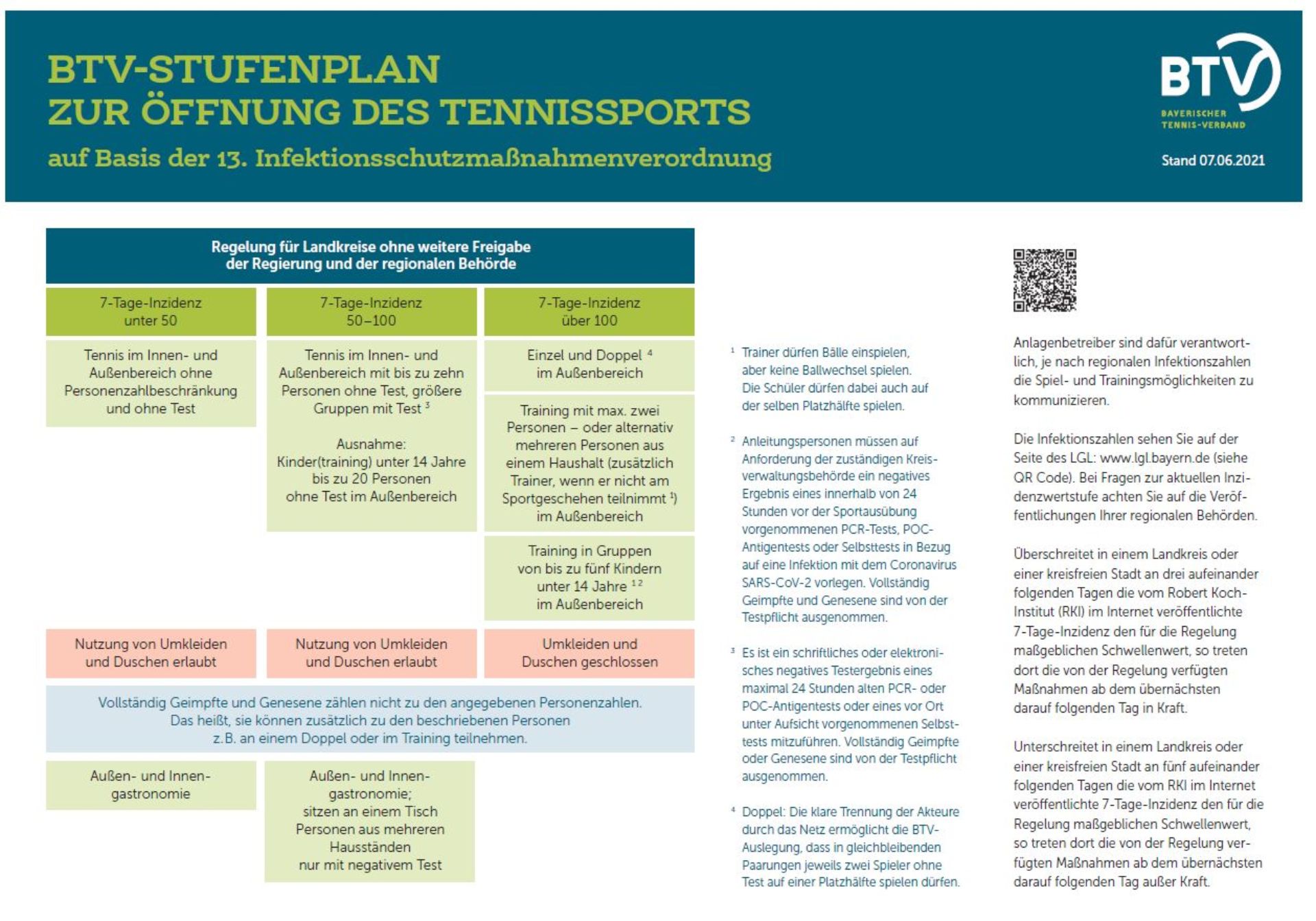 Derzeit kann Einzel gespielt werden. Doppel ist nur mit Spielern*innen aus einem gemeinsamen Haushalt erlaubt. Für das Spielen mit Trainer gibt es diverse Regeln. Wie das Tennisspiel bei unterschiedlichen Inzidenzwerten in Bayern geregelt ist, könnt ihr dem "Stufenplan" des Bayerischen Tennisverbandes (BTV) vom 10.5.2021 entnehmen. Maßgeblich für den Sportbetrieb während der Pandemie sind aber die sogenannte "Bundesnotbremse" und die 12. Bayerische Infektionsschutzmaßnahmenverordnung. Aber auch das Landratsamt kann Maßnahmenverordnungen erteilen und Sportplätze sperren. Nicht der BTV entscheidet, wie und wann gespielt wird. Die Verantwortung zum Betrieb der Sportanlagen hat der Verein.