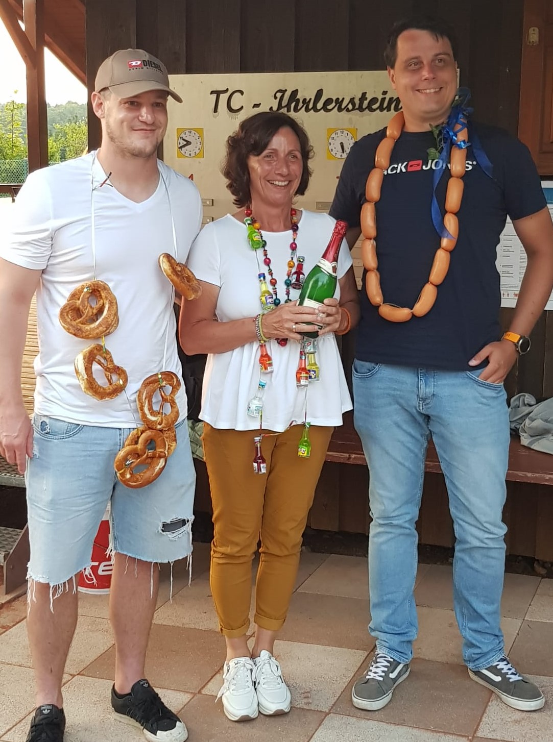 Nach vier Jahren Pause gabs endlich mal wieder ein Schleiferlturnier. 26 SpielerInnen machten mit und hatten richtig Spaß bei vielen tollen Ballwechseln. Nach fünf Spielrunden hingen fünf Schleiferl am Schläger von Birgit Kleine Büning. Das brachte ihr am Ende den ausgelobten ersten Preis: Einen bunten Schnapskranz. Mike Fischer und Flo Hackl wurden mit Knacker und Brezen behängt.