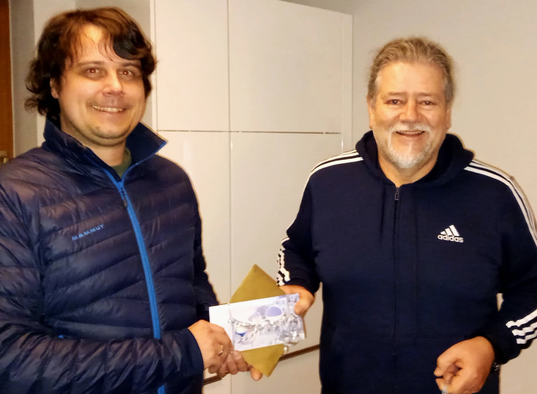 Flo Hackl bedankt sich mit einem Präsent für die langjährige Funktionärstätigkeit bei Armin Steger