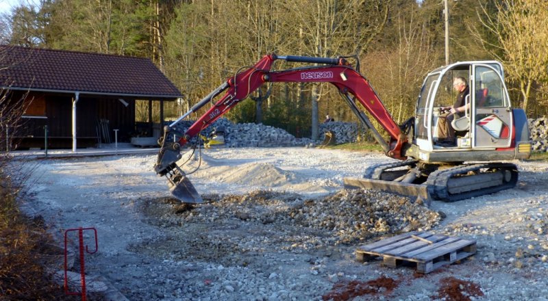 es gibt gute Nachrichten von der Baustelle am Tennisparkplatz. Adolf Rösch hat heute mit dem Bagger die obere Schicht Schotter abgetragen. Am Donnerstag folgen die Restarbeiten zur Vorbereitung für die Pflasterarbeiten. Am Freitagvormittag wird ein Teil der Randsteine einbetoniert.