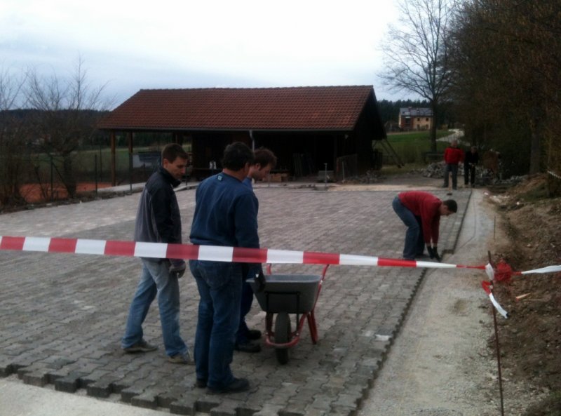 Bei zwei hervorragenden Arbeitseinsätzen mit jeweils 12 - 18 Helfern haben die Tennisler Teamgeist bewiesen. Nur mit guter Zusammenarbeit waren die sehr anstrengenden Arbeiten zum Pflastern unseres Parkplatzes zu bewältigen. Tausende von Betonsteinen sind am Freitag und Samstag per Hand verlegt worden. Schon Tage zuvor wurden die Vorarbeiten erledigt. Der Parkplatz ist jetzt zum großteil fertig belegt, aber noch lange nicht fertig.