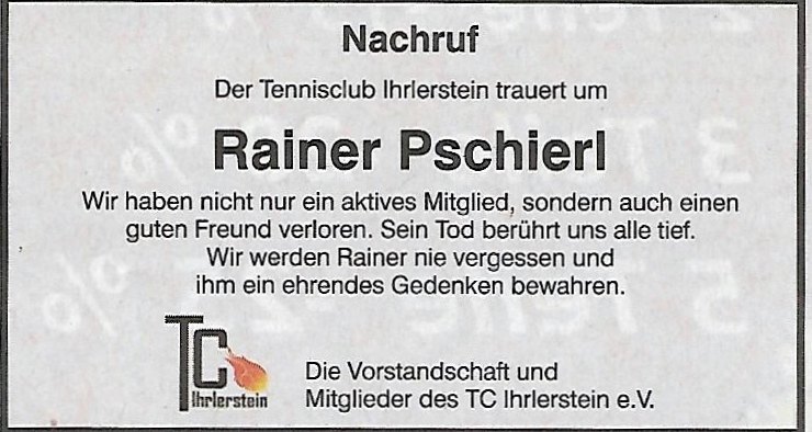 Am Montag, den 12. August 2019 ist unser langjähriges Vereinsmitglied Rainer Pschierl nach einer schweren Krankheit verstorben. Sein Tod berührt uns alle tief.