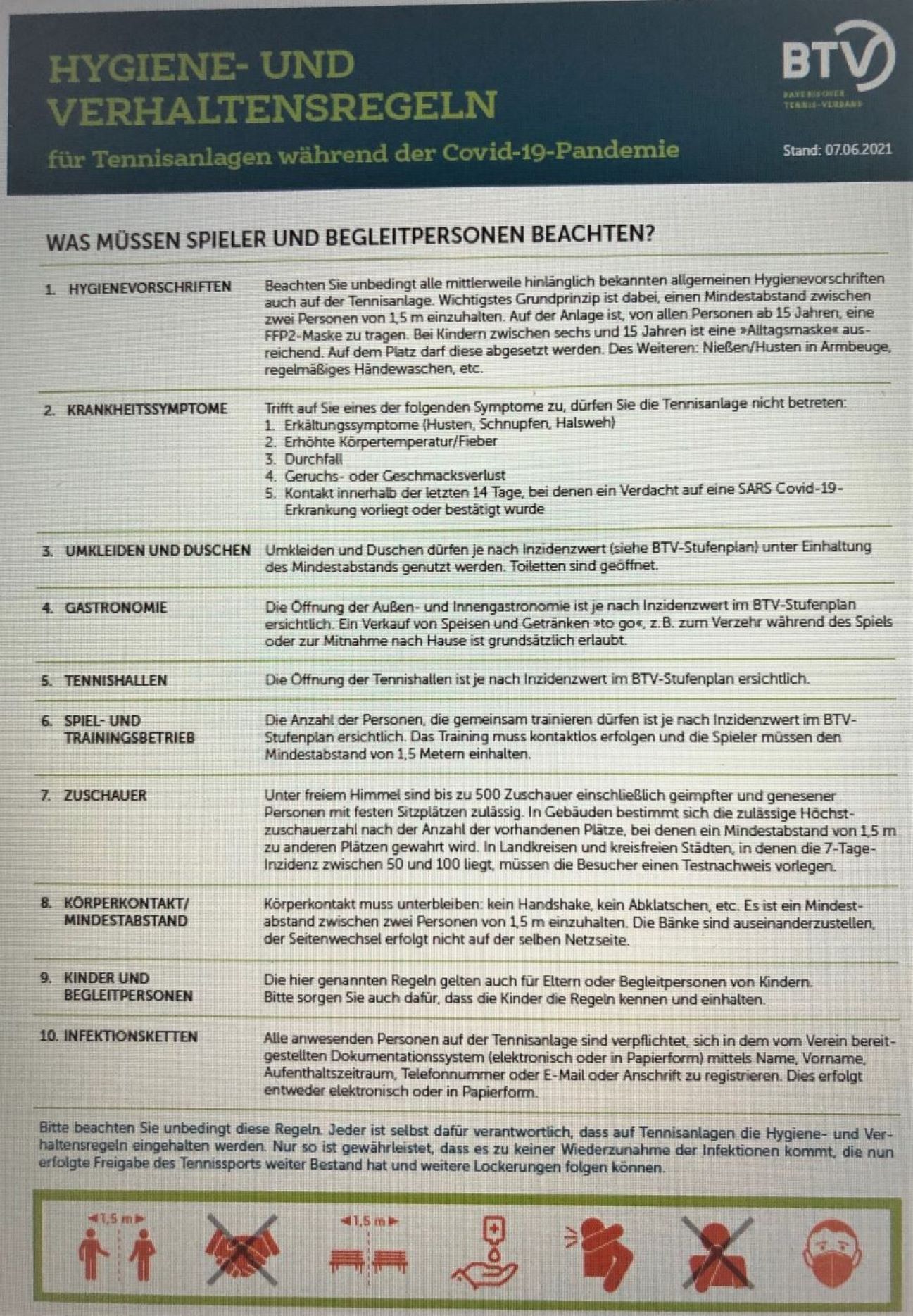 Unser Tennisheim darf derzeit nur zum Holen von Bällen und Getränken betreten werden. Die Terrasse und die Dusch- und Umkleideräume bleiben geschlossen. Die Toiletten können benutzt werden. Die Hygiene- und Verhaltensregelungen auf den bayerischen Tennisanlagen könnt ihr hier lesen.