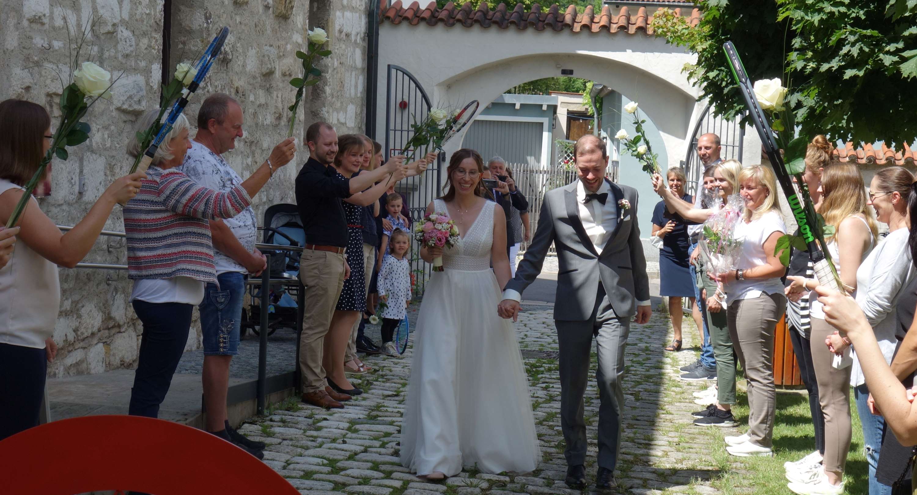 Nini Roithmeier und ihr Mann Flo haben sich im Kelheimer Standesamt das Ja-Wort gegeben. Bei der kleinen Feier im wunderbaren Hof des Archäologischen Museums gratulierte der Vorsitzende Armin Steger mit einem kleinen Präsent und wünschte den beiden alles Gute für die gemeinsame Zukunft. Viele Tennisler kamen zum Spalierstehen.