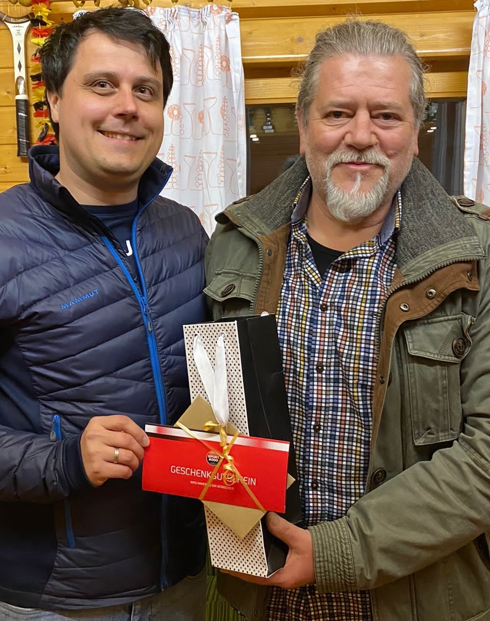 Flo Hackl bedankt sich mit einem Präsent für die langjährige Funktionärstätigkeit bei Armin Steger